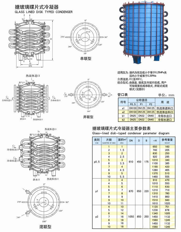 1、搪玻璃碟片式冷凝器分P1型及PO. 5型兩種型號(hào)。伶凝面積P0.5型,每片為0.5平方米,設(shè)備外徑為700mmo P1型,每片冷凝為1平方米,設(shè)備處徑為960mm。定型規(guī)格為1. 5-15平方米系列,可根據(jù)所需冷凝量來選擇。